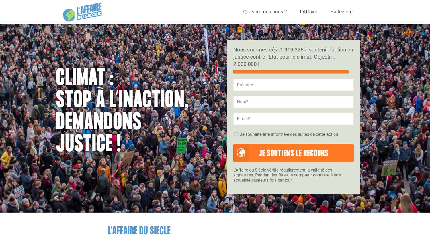Petition calling for the French government to take measures to fight climate change (screenshot, 30 December 2018: Note they had 919,326 signatures at that point) Source: L’affaire du siècle website