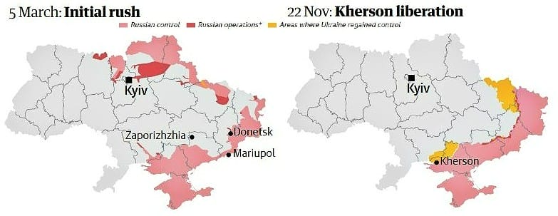 The result can be appreciated at a glance, comparing the two maps of Ukraine showing Russia’s opening campaign in March and the closing position in November: