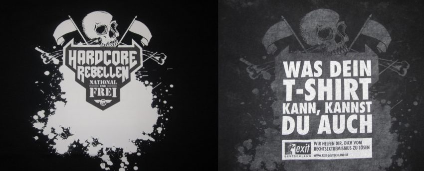 The surprise effect became visible after the T-shirt was washed once. Our message appeared: ‘What your T-shirt can do, you also can do – We help you to free yourself from right-wing extremism. EXIT-Germany’. The goal was to increase the awareness and popularity of EXIT-Germany in the scene and particularly to target the youths that have not yet firmly settled in the right-wing extremist scene.
