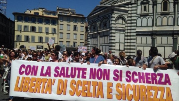 In the photo: Women protesting in Florence, Italy against obligatory vaccination for children entering school. The slogan reads: “No joking with health – Freedom of choice and Safety” Source: article in Czech press: “Italy: Despite massive protests, the government has enforced compulsory vaccination” (referring to the previous government’s policies)