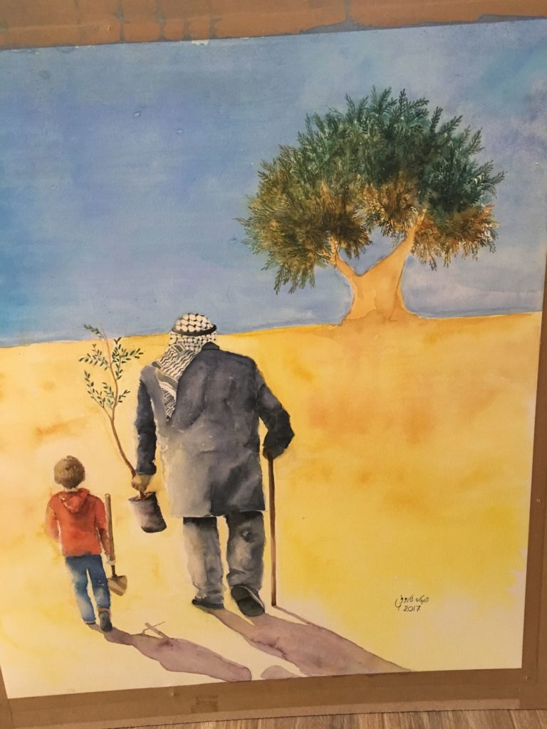 Shaima’ Farouki is one of my favorite up-and-coming artists, maybe because I know her personally to be one of the sweetest human beings around. Shaima’ tries many different styles and materials; this one is actually atypical. I love it because it’s such an unremarkable event in Palestinian culture: a respected elder taking a child to care for olive trees. It’s the way the love of the olive tree is passed down through generations, but it could easily go unnoticed.