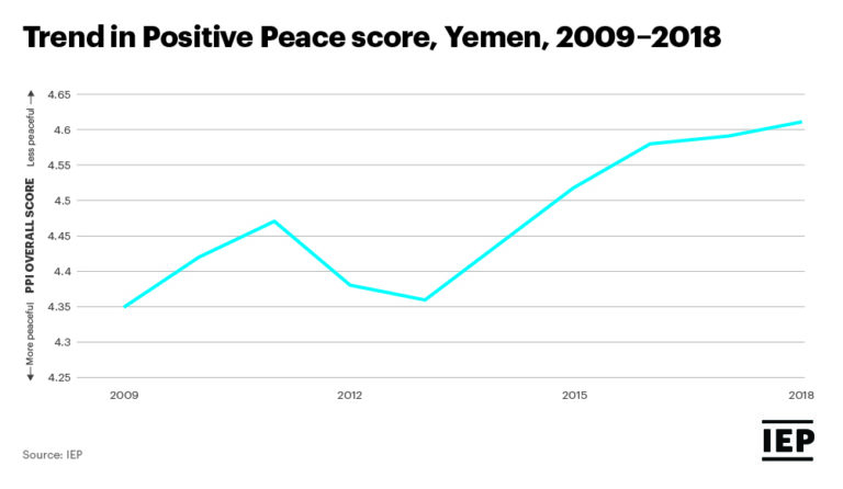 The figure below illustrates the significant decline in Yemen’s Positive Peace since 2013, which has worsened as a result of prolonged conflict.