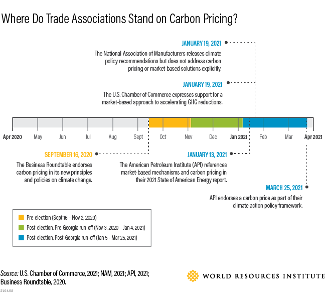 Following public pressure to align with BRT’s new positioning, the U.S. Chamber of Commerce (“Chamber”) updated its own stance a few months later. The Chamber is a politically powerful trade association, which outright opposed the Waxman-Markey cap-and-trade bill and continued to spend money in recent years on ads that discouraged climate policy. However, in January 2021, the Chamber updated its position on climate change to include support for market-based approaches to reducing greenhouse gas emissions. The statement is notably vague, and though the Chamber provided no evidence that this position would translate into support for carbon pricing specifically, a tax on CO2 could theoretically fall under the “market-based” umbrella.