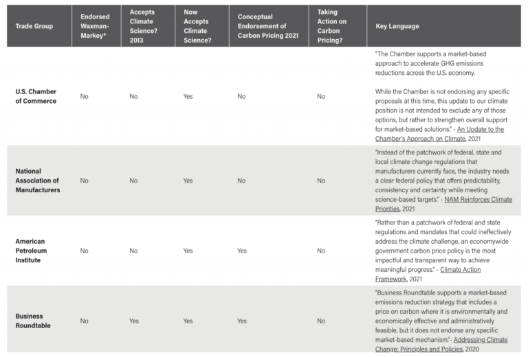 The range of changes on carbon pricing from trade associations is notable, considering their positions in the recent past. However, these changes are still woefully inadequate in helping the United States align with the goals of achieving net zero by 2050.