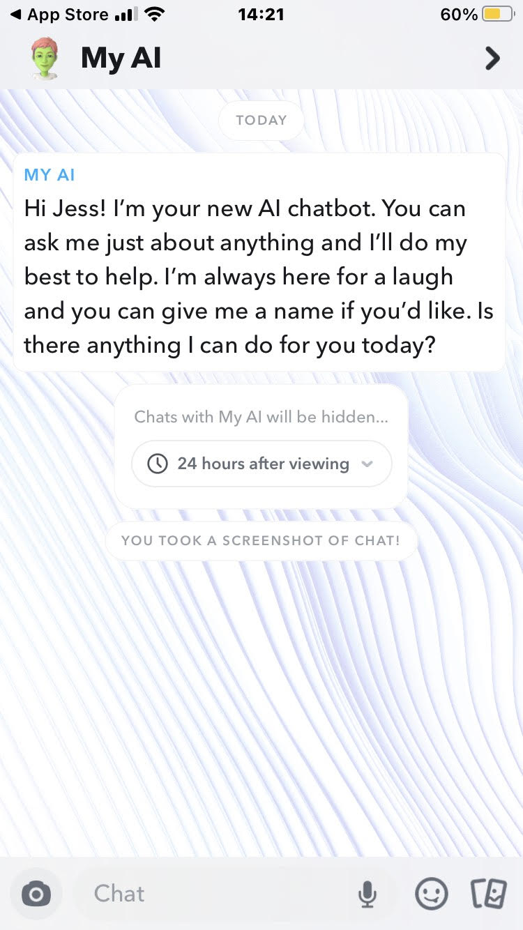 I was also surprised by how customisable it was. Users can change the appearance of their chatbot and its outfit, as if they are designing a person. They can also name the bot, which is initially called “My AI.”
