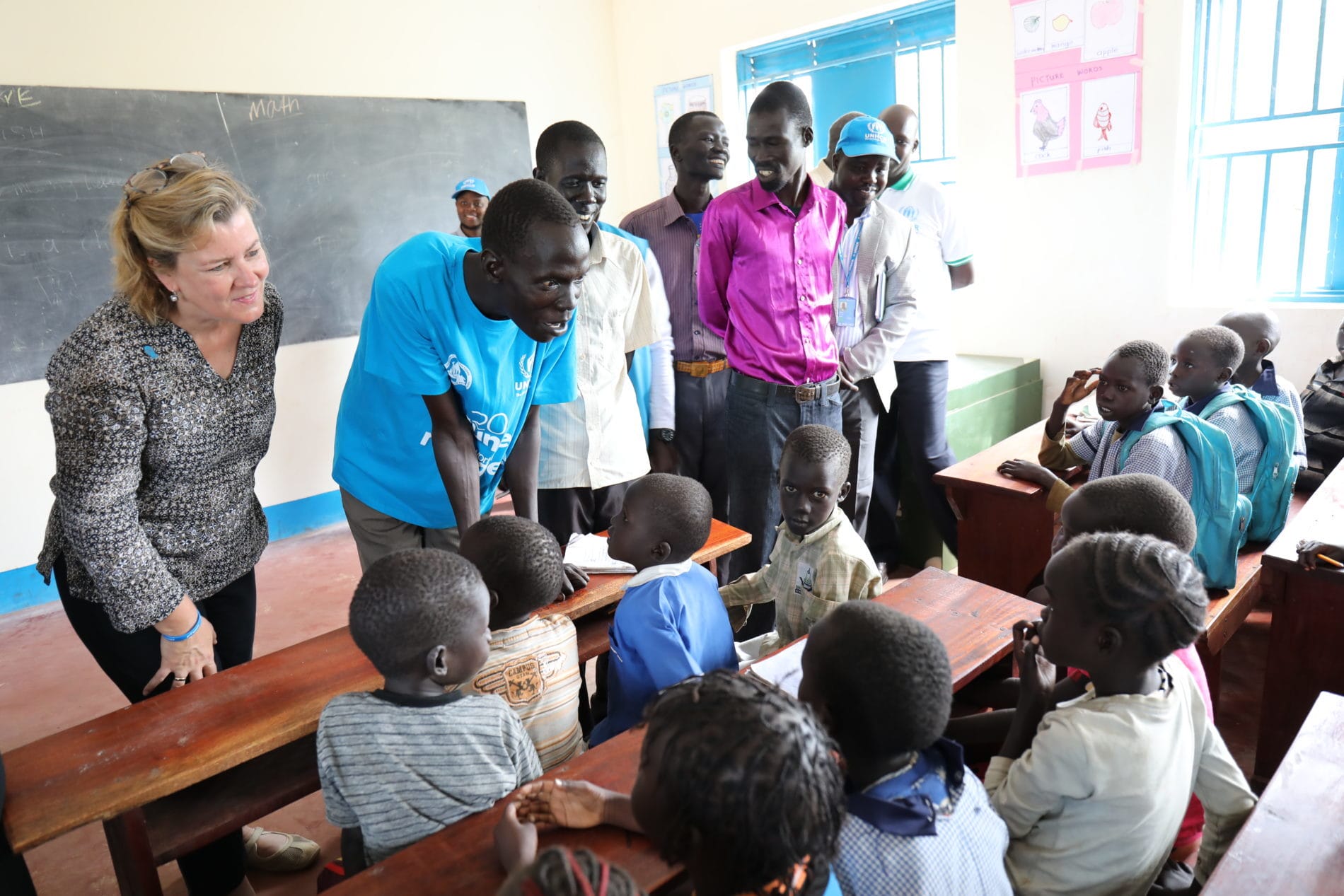 In the photo: South Sudan. Deputy High Commissioner meets Ethiopian refugee children — The Story: UNHCR Deputy High Commissioner Kelly T. Clements speaks to students in a primary school class in Gorom Refugee Camp. ; Despite having 2.4 million people living in exile and 1.7 million internally displaced inside South Sudan (as of June 2018), the world’s youngest country is itself hosting close to 300,000 refugees from neighbouring countries. During her first visit to South Sudan, UN Deputy High Commissioner for Refugees Kelly T. Clements met refugees from Ethiopia and Sudan at Gorom, Pamir and Ajoung Thok refugee camps. She also met internally displaced South Sudanese in a UNMISS Persons of Concern site and spent five days familiarising herself with the operation, meeting South Sudanese ministers, refugee leaders and UNHCR staff. South Sudan is Africa’s worst refugee crisis and the world’s third largest. According to data, over a million South Sudanese are at risk of famine and in 2018 more than half of the population will be reliant on emergency aid. Photo Credit: © UNHCR/Vi Tran