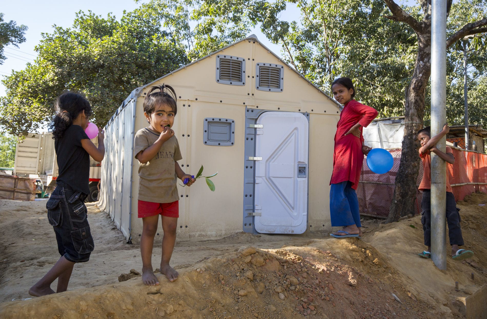 In the photo: Bangladesh. New arrivals at UNHCR Transit Centre – The Story: Children from newly arrived Rohingya families from Myanmar take shelter in the UNHCR Transit Centre in Kutupalong camp, using the new Refugee Housing Units. ; With 900,000 Rohingya refugees in Bangladesh constituting more than 200,000 households, the settlements in Cox’s Bazar are among the largest in the world. Over a year since the largest wave of displacement in 2017, UNHCR continues to respond to the urgent and ongoing humanitarian needs in the camps in Cox’s Bazar, including Kutupalong, Nayapara and Ukhia. Helping provide adequate shelter, clean water, sanitation, alternative sustainable fuel, protection for vulnerable people and survivors of sexual and gender-based violence are among the priorities. Almost 700,000 Rohingya refugees fled Myanmar, seeking safety in Bangladesh in 2017. Photo Credit: © UNHCR/Roger Arnold