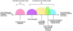 Never heard of this one? I’m not surprised — I made it up, for the sake of clarifying often-overlooked yet meaningful distinctions. These organizations start with social mission, much like a nonprofit, and then figure out a way to make it work outside the restrictions of a tax-exempt model — in other words, they’re a for-profit business. They exist primarily to address a social issue (“mission-first” or “mission-centric”), with revenue-generating activities intertwined with change-making activities.