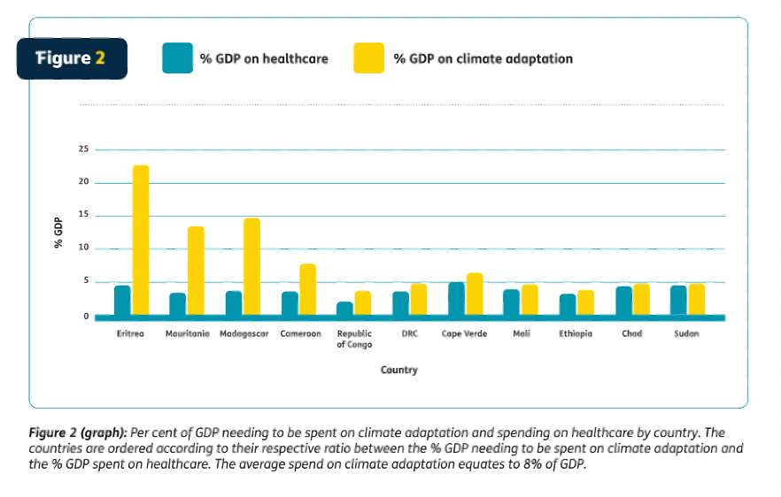 The report compared the estimated climate national adaptation costs (outlined in their Nationally Determined Contributions – NDCs, or National Adaptation Plan – NAP, World Bank 2020) of Cameroon, Cape Verde, Chad, the Republic of Congo, the Democratic Republic of the Congo, Eritrea, Ethiopia, Madagascar, Mali, Mauritania, and Sudan, against their health expenditure as a % of GDP (World Bank 2019), and found that the countries could face climate adaptation costs that are up to five times higher than their national spend on healthcare.