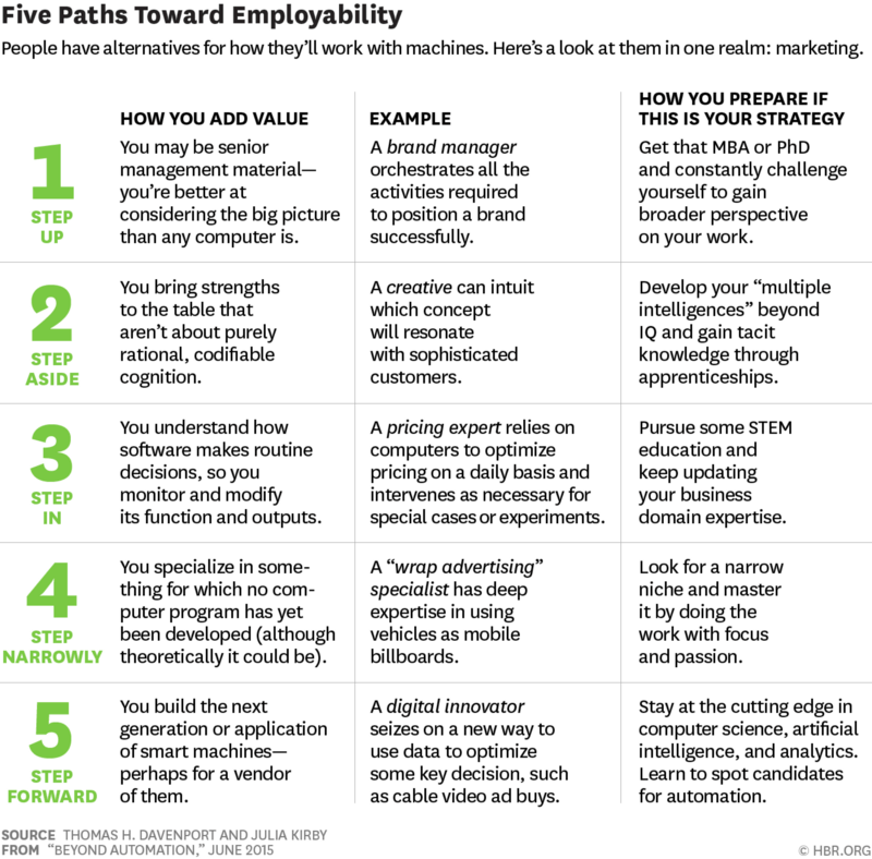 Now, we know that the Robots are coming for our jobs, how do we “renegotiate our relationship” with them. Here is Davenport’s recommendation.