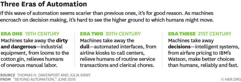 Before we delve into them; let us take a look at the 3 eras of automation. The image below reveals how the work done by robots have shifted from just manual labour to automation of routine tasks, now creeping into more cognitive tasks such as decision-making.