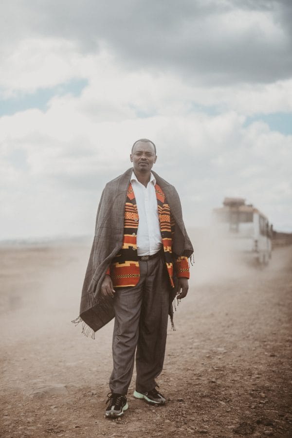 Amongst the subdued tones of a drought-stricken field in Ethiopia emerges a family of three, each dressed in exquisitely patterned red and black textiles. There is a striking theatricality to the photograph, the textiles’ rich colours are so at odds with the pale hues of the field. The contrast is typical of internationally renowned artist Xiomara Bender’s new exhibition, where the drama is not in her subjects’ steady gazes but in the textiles that they are wearing. In another photo, a man sits in a field of motley brown cows dressed in an impeccable white vest with coloured woven details and a soft watermelon coloured shawl draped over his shoulders. Another family are cocooned in swaths of crisp white and pastel coloured shawls. The beauty of the textiles are front and centre in the portraits, and they tell us something particular about those that are wearing them.