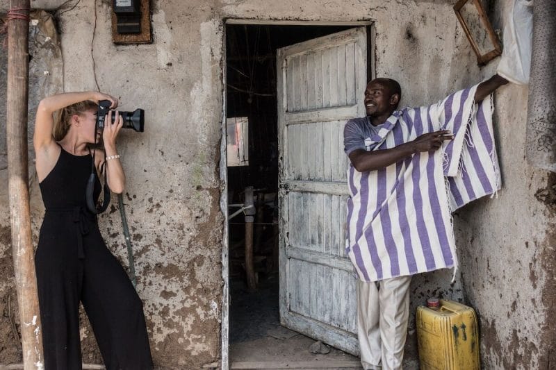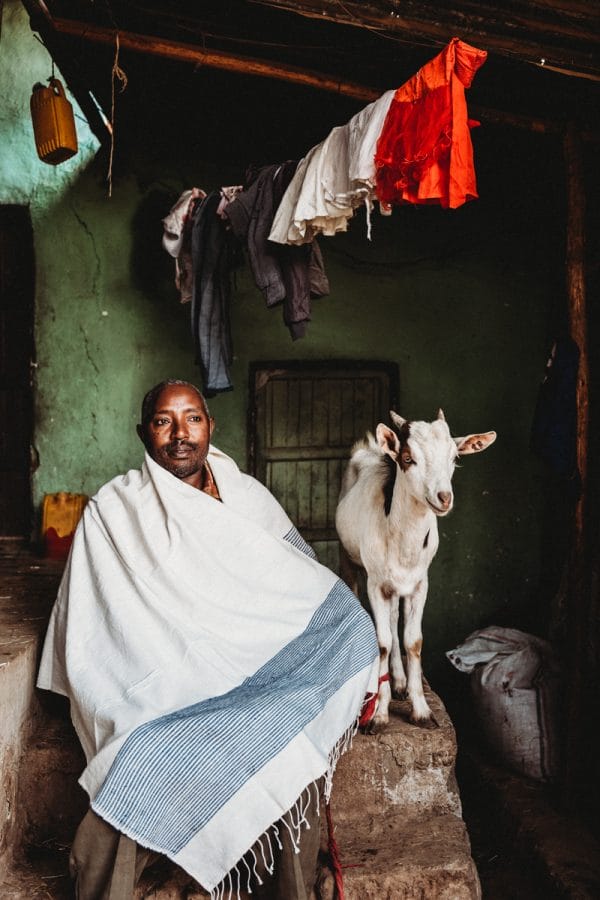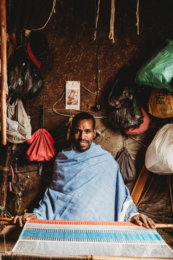 Atinafu Abebe is one of the young weavers featured. Wrapped in a celestial blue fabric and with a lingering smile, Abebe is just 25 years old. He lives in Addis Ababa with his wife and two children. In taking part in this project, Abebe hopes that he will be able to receive a loom. And with that precious instrument, support his family and carry on the ancient heritage of weaving. Right now, life for Abebe and his fellow weavers in Ethiopia is difficult. The country has long battled drought and famine and many families struggle to eat two meals a day.