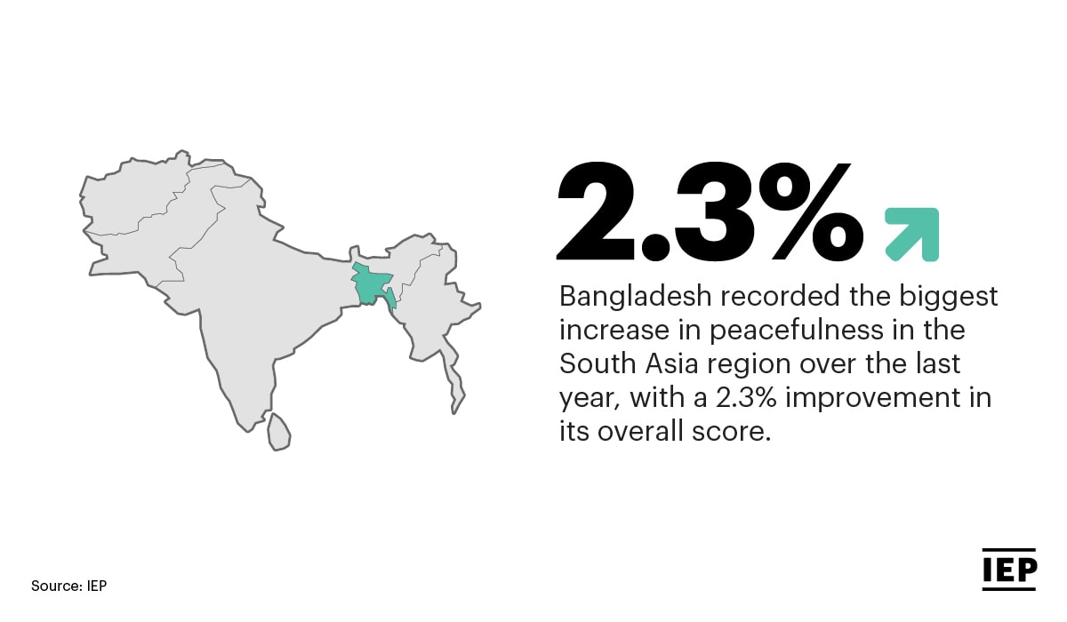 According to the 2020 Global Peace Index, Bangladesh recorded the biggest increase in peacefulness in the South Asia region over the last year, with a 2.3% improvement in its overall score. Its score improved across all three domains, with the largest improvement on the Safety and Security domain.