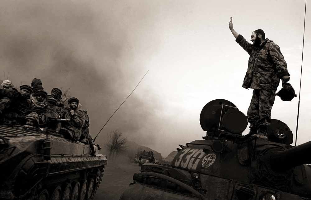 In The Photo: Northern Alliance tanker Abduwali cheers his fellow mujahedeen as they prepare to take Khanabad and Konduz in northern Afghanistan in the weeks following 9/11. Photo Credit: cheryldiazmeyer.com