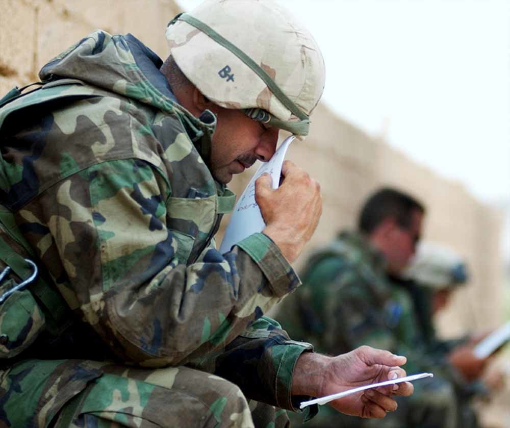 In The Photo: After three weeks and 300-plus miles of speed-and-maneuver warfare, Master Gunnery Sgt. Frank Cordero savors the first letters from his wife, Melissa, on April 7, 2003. “I held that first one for about five minutes…just to smell it and hold it.” Photo Credit: cheryldiazmeyer.com