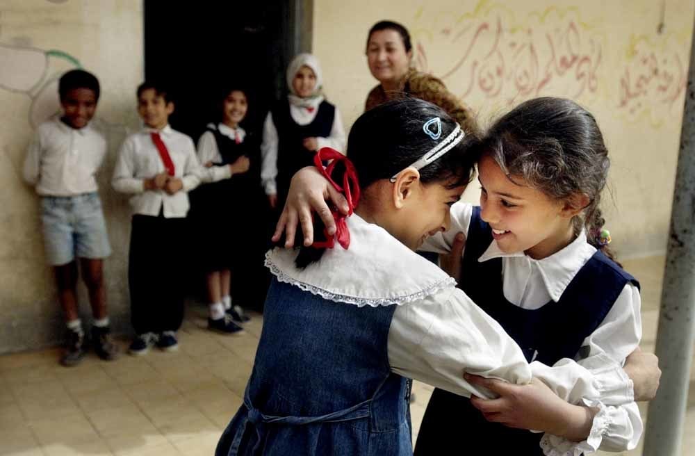 In The Photo: After the initial days of the invasion of Iraq in 2003, Fatma Mohammad and Zubaida Salman, left and right, greet each other warmly at Al Amtithal Elementary School, the first to reopen in Baghdad. Photo Credit: cheryldiazmeyer.com