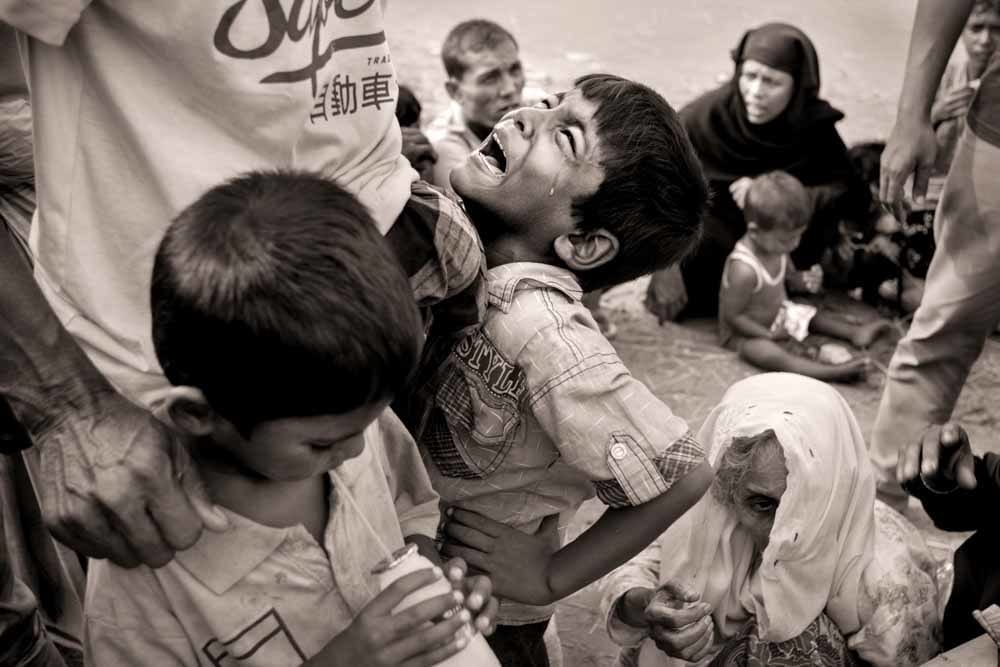 My quick decision was not without complications. I was held at the airport in Bangladesh immigration for several hours trying to procure a visa. Eventually, I was released and made it to the border area where refugees were arriving. It was overwhelming. Thousands of refugees arrived daily on Bangladeshi shores. And the Bangladeshis were in general kind and receptive to the Rohingya, despite having welcomed many thousands more Rohingya on their shores in previous years. The temperature was blistering hot. My goal was to show the gravity and degree of suffering the Rohingya were subjected to by the Myanmar army and Buddhist vigilantes. The stories they shared were horrific and heartbreaking.