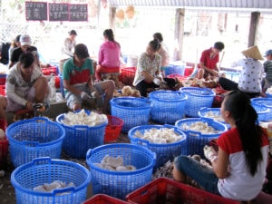 IN THE PHOTO: Separating coconut meat from husks is done manually. Nothing gets wasted. CREDIT: FAO/Soojin Kim