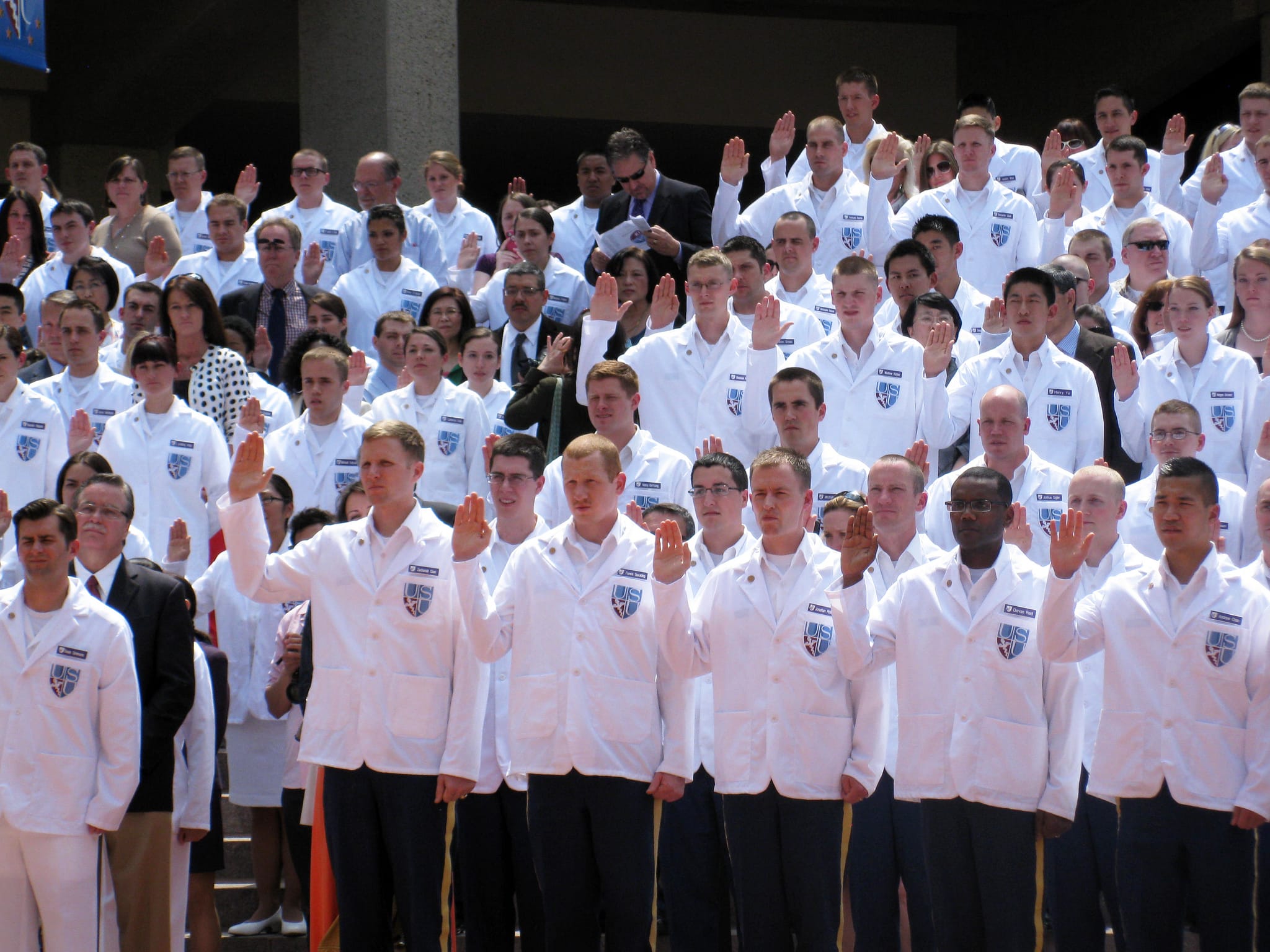 In the Photo: Military medical students raise their right hand and take the Hippocratic oath. Photo Credit: Flickr/MilitaryHealth