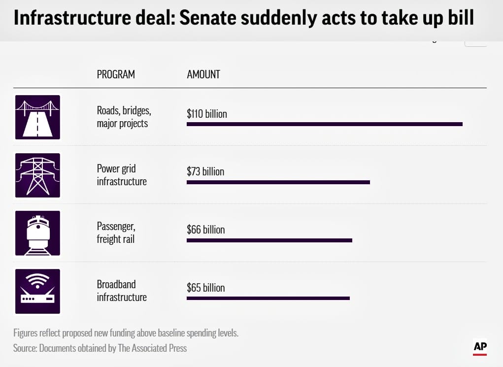 The bipartisan legislation is running alongside a progressive-backed $3.5 trillion “human infrastructure” bill that will focus primarily on the divisive climate change and healthcare sectors.