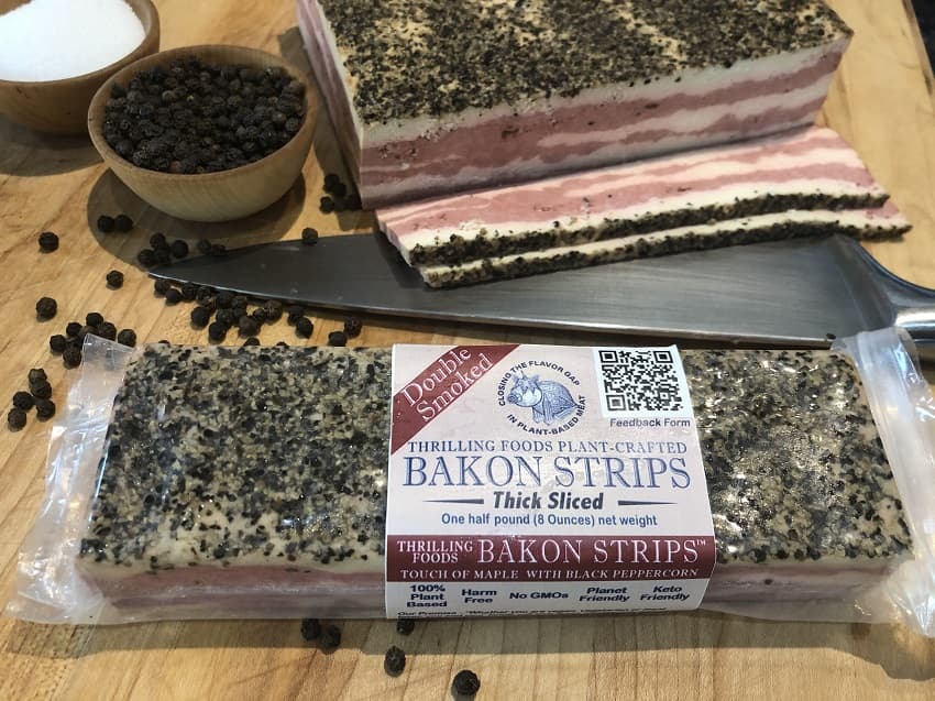 Thrilling Foods (US) — manufactures and sells Bakon, a patented bacon alternative made from soy milk that is traditionally salt cured and hardwood smoked. Bakon is composed of both fatty and lean layers that constitute a very similar texture and macronutrient values to traditional pork bacon.