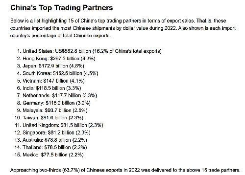 - China’s top trading partner has been and continues to be the US and no BRICS member figures in that top list of trading partners. The only BRICS member that shows up there is (inconveniently) India, and it’s on a par with Germany: