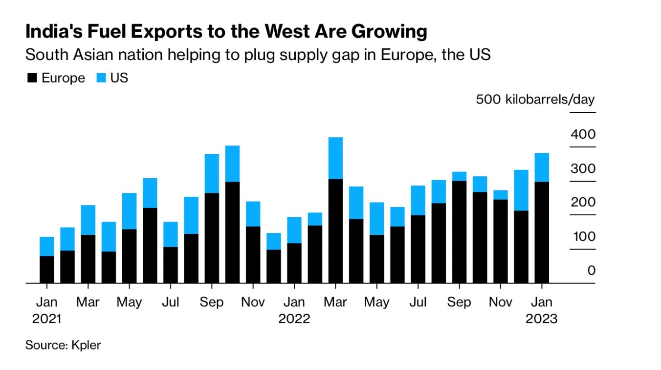 India’s fuel exports to the European Union (EU) and the US have grown drastically in the past year. In January alone, India shipped 89,000 barrels a day of gasoline and diesel to New York, the most in nearly four years. Last year, India’s imports accounted for 5% of total oil imports to this region. Now it’s 40%.