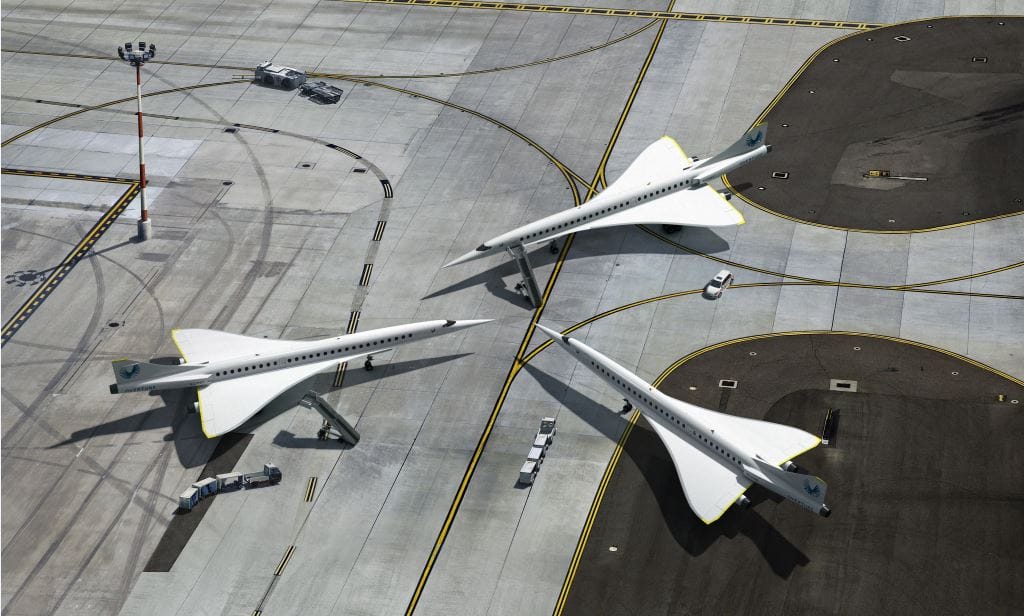 IN THE PHOTO: Rendering of three Boom’s Aircrafts on the tarmac PHOTO CREDIT: Boom Supersonic