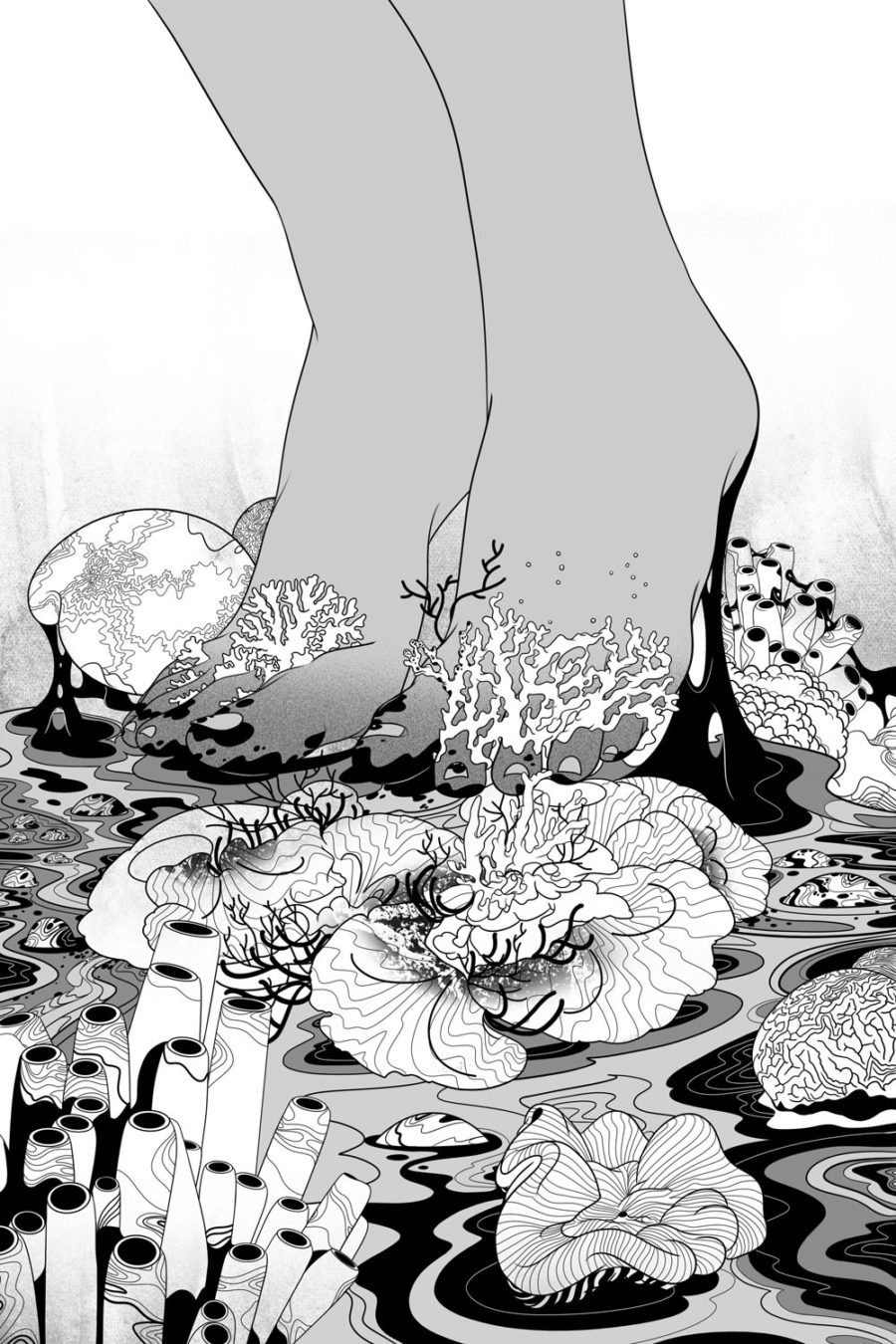 There are a few reasons I chose to do this. Firstly, in response to the growing issue of coral bleaching, I imagined scapes in which the reef had been drained of colour completely. Secondly, I felt that if the works were in colour, they may not hit their mark thematically. Coral reefs are typically so colourful and vibrant, that I felt it would be difficult to portray the sinister nature of the dangers it’s facing with saturated colours and bright tones. Thirdly, and more pragmatically, it helped to tie all the works together into a cohesive series.