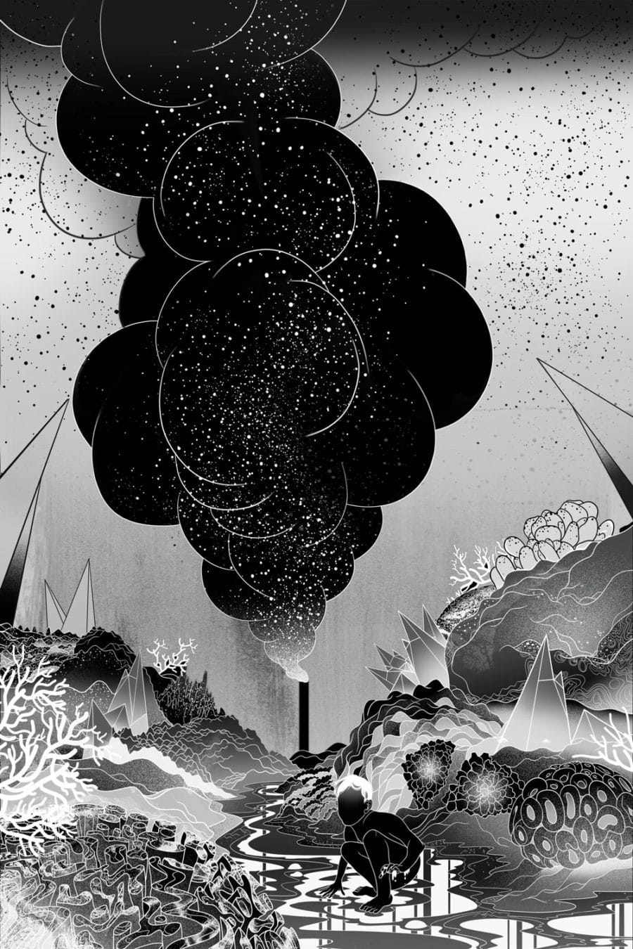 There are a few reasons I chose to do this. Firstly, in response to the growing issue of coral bleaching, I imagined scapes in which the reef had been drained of colour completely. Secondly, I felt that if the works were in colour, they may not hit their mark thematically. Coral reefs are typically so colourful and vibrant, that I felt it would be difficult to portray the sinister nature of the dangers it’s facing with saturated colours and bright tones. Thirdly, and more pragmatically, it helped to tie all the works together into a cohesive series.