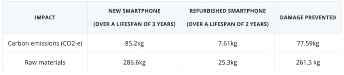 A refurbished smartphone also requires 87% fewer raw materials than a brand-new one.