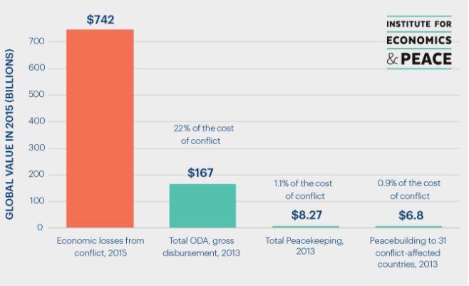 In the diagram by IEP, we see the cost of conflict compared to Official Development Assistance, UN peacekeeping and peacebuilding spending.