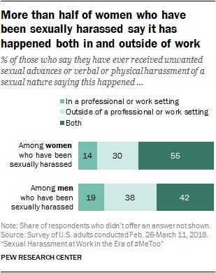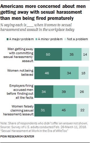 In similar studies, Pew finds, unsurprisingly, that, in and outside the workplace, women are nearly twice as likely to have been assaulted or harassed, and their main concern is not the firing, but the lack of accountability of the perpetrators