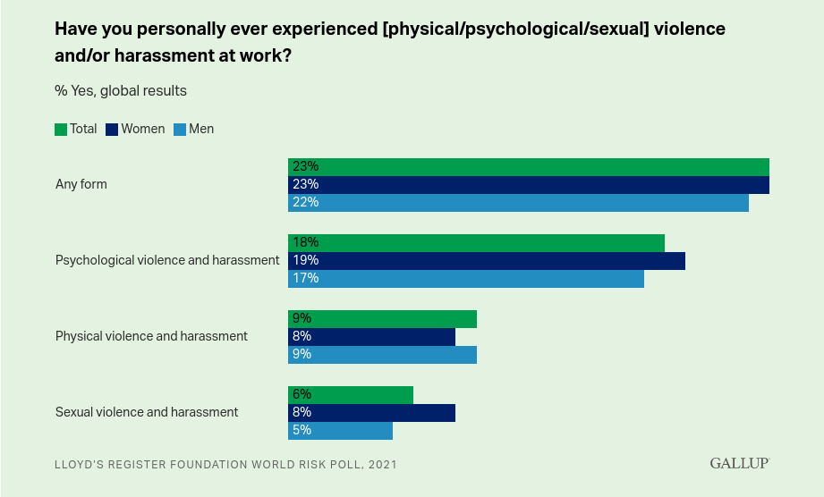 Gallup, less than a month ago, published a study that found that 23% of adults worldwide were abused or harassed—verbally, physically or psychologically. This would translate to 750 million employed adults worldwide subject to the mental and bodily wounds of a workplace.