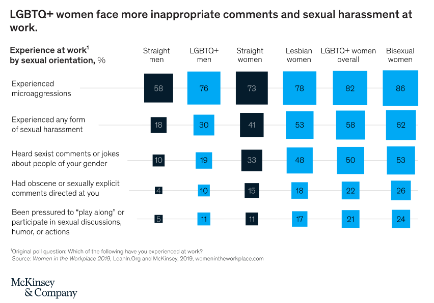 Well in keeping with modern understandings of intersectionality, Mckinsey finds that LGBTQ+ women and women of culture are significantly more likely to receive these patterns of behaviour and attacks.