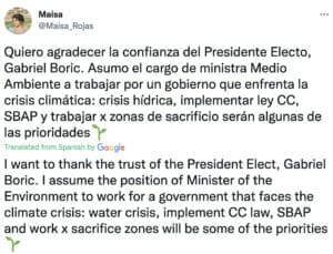 She mentioned in an interview with La Tercera that the new program of President-elect Boric addresses mitigation and adaptation and also fair climate action, explaining that these are a response to the fact that we are living in a crisis and that quick actions are required from the whole society.