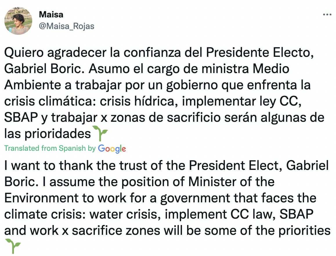 “It is understood that [climate change] is not only an environmental problem but also a social and economic one, which has to do with the country’s development model. Chile has already taken a position on the matter by committing to be carbon neutral by 2050, and that this transition cannot be just any transition, but has to be a just transition,” she told El Mostrador in December 2021.