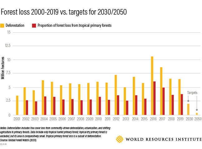 Deforestation has increased on average since 2001. Particularly concerning is loss of primary forests (see red bar below), which are irreplaceable in terms of biodiversity, ecosystem function and carbon sequestration.