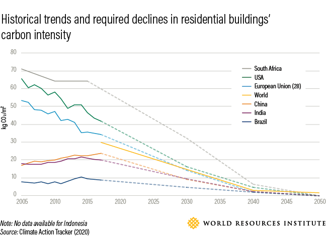 Relatedly, the carbon and energy intensity of existing residential and commercial buildings have been gradually falling across major emitting economies, with a few exceptions. But this decline needs to happen much faster in most countries to be on track for a 1.5 degrees C (2.7 degrees F) future.
