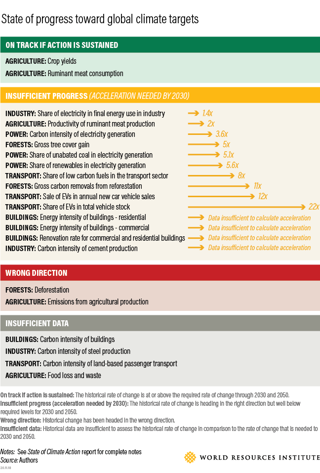 The State of Climate Action report assessed 21 indicators across six key sectors. Of all the indicators assessed, two show a historical rate of change sufficient to meet both 2030 and 2050 targets; 13 indicators show change headed in the right direction, but too slowly; and two show change headed in the wrong direction altogether. Data are incomplete to assess progress in four indicators.