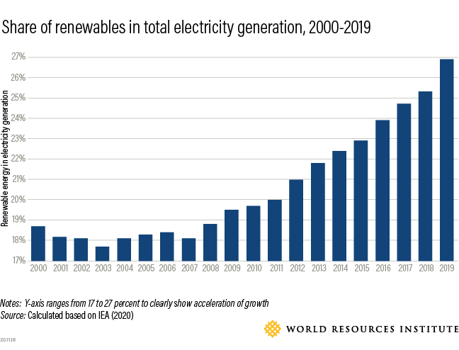 Renewable energy is now the generation technology of choice, making up 72% of new capacity in 2019. The rate at which it is being added globally has been increasing year over year, and its share of total electricity generation reached around 27% in 2019.