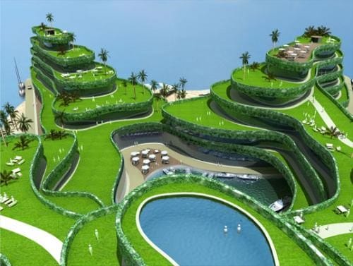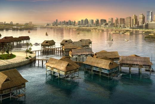 The Maldives is slated to be hit first by rising seas and it has prepared for it, with a $500 million project, paid for by the Maldivian government and private investors, is slated for completion in 2015. It consists of a network of floating islands designed by Waterstudio, the first to be put in place next year, to accommodate hotels, a convention center, yacht club and villas. The “islands,” secured by steel cables, are made up of pontoons with a foam core encased in concrete that can be joined together like Lego blocks. An 18-hole golf course will also be set on such platforms, each with two to three holes, connected by underwater tunnels.