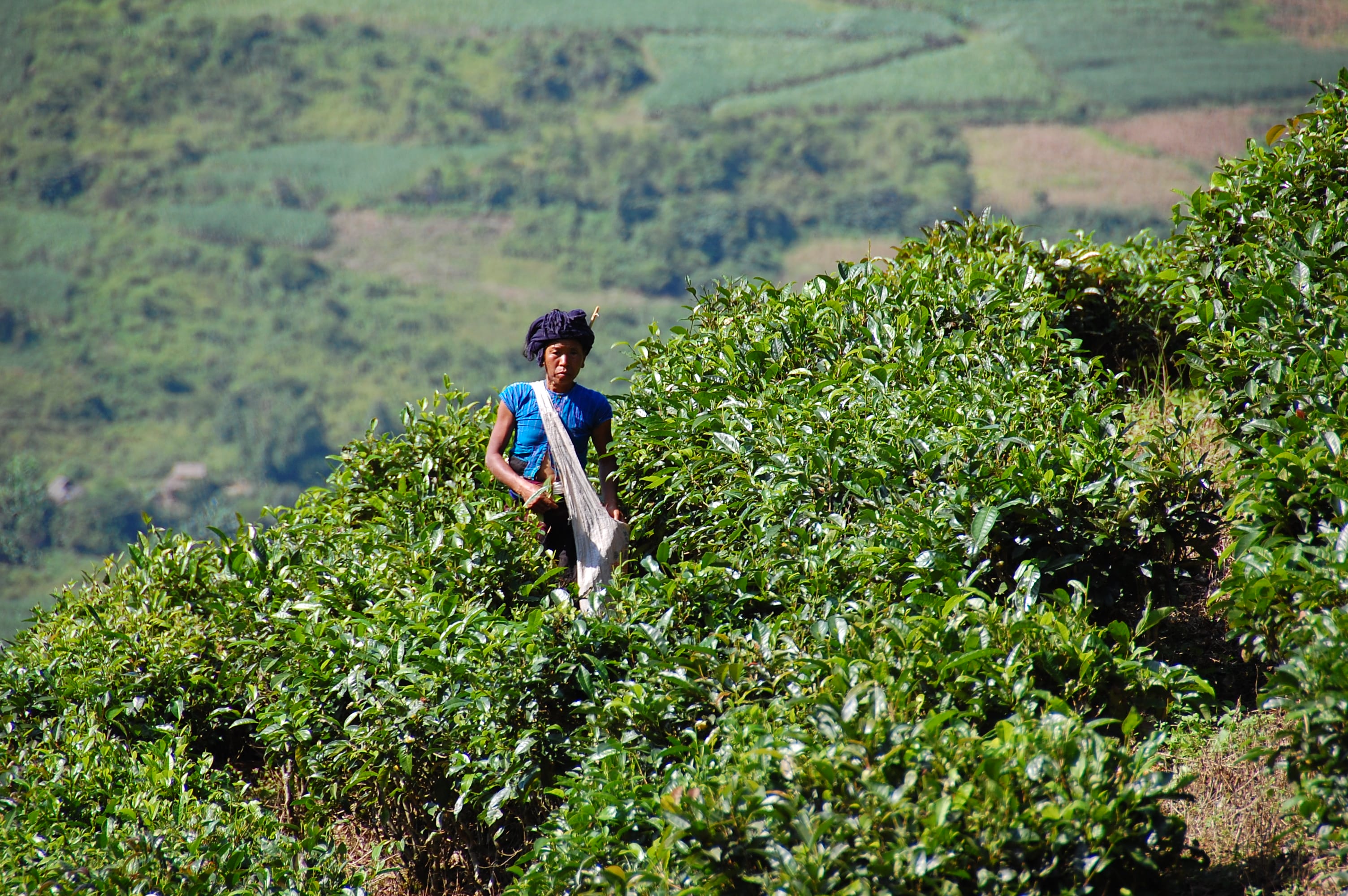 In the photo: Tea worker in Yunnan Province China collecting tea in terraced fields, a practice at high risk for the effects of climate change — photo credit to Morgann.