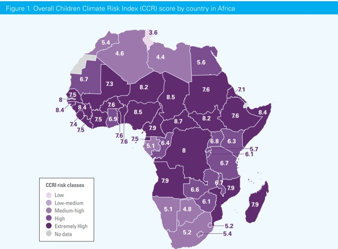 Children in all African countries, the report found, are exposed to the environmental effects of human-made climate change. However, 39 out of the 49 countries for which data is available are at a “high” or “extremely high” risk.