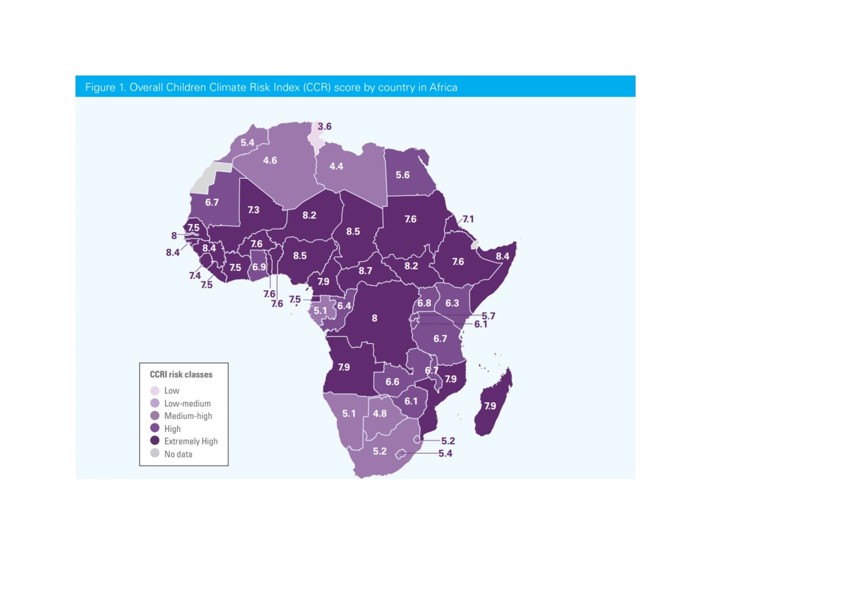 Children in all African countries, the report found, are exposed to the environmental effects of human-made climate change. However, 39 out of the 49 countries for which data is available are at a “high” or “extremely high” risk.