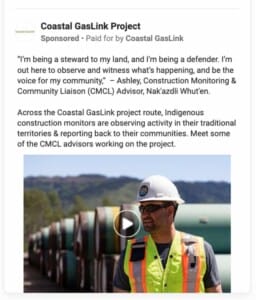 For example, in October of 2021, protests to the Coastal GasLink pipeline occurred after a Wet’suwet’en hereditary chief was arrested for blocking pipeline construction. Subsequently, over the following five weeks, TC Energy and associated groups launched dozens of ads that were projected 1.7 million times across Canada.