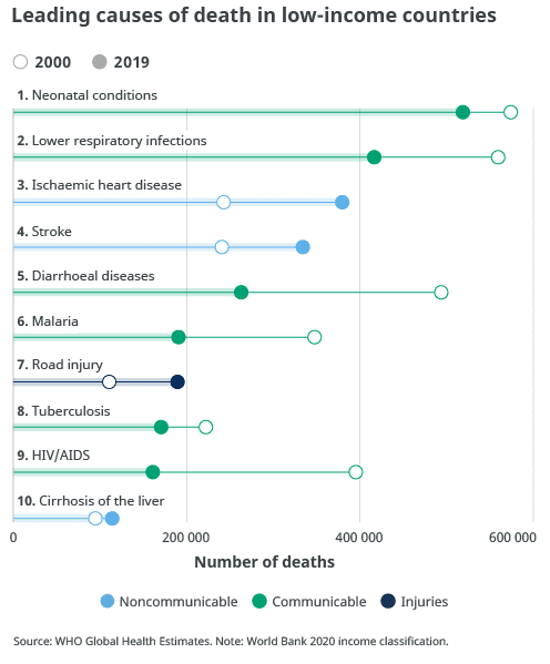 A shortcut and useful tool in understanding these differences is the World Health Organization (WHO) use of the World Bank classifications of world economies into four income groups, based on gross national income – low, lower-middle, upper-middle, and high. Detailed data and graphs are provided by WHO in its top 10 causes of death, with the global aggregated picture below: