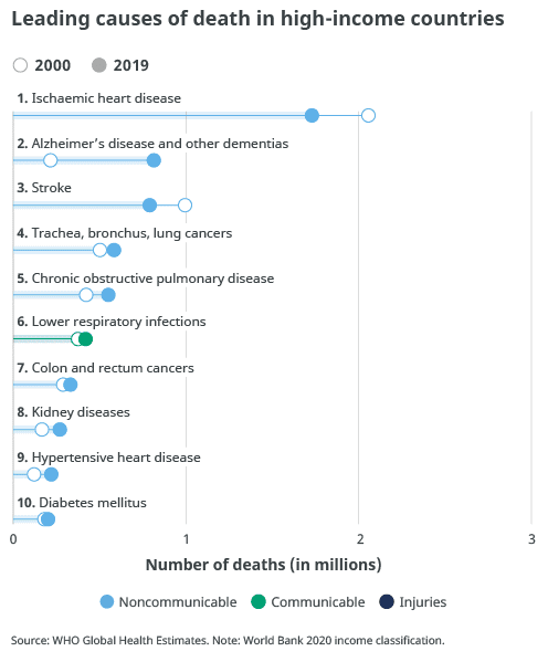 - high-income countries: As with upper-middle-income countries, cardiovascular disease is the highest cause of death and there is only one communicable disease that is in the top 10 causes of death. Alzheimer’s disease and other dementias, stroke, appear as leading causes of death, as well as lung cancers.