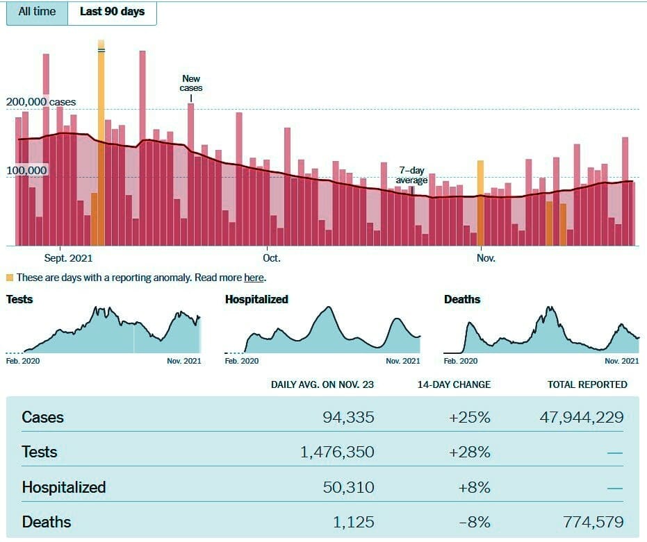 Countries have been experiencing wave after wave of COVID infections, whether from the Delta or other variants. In the United States, COVID cases have surged about 30 percent in November, despite prediction models of a continuing decline. Here are the New York Times tracking results for the US in the last 90 days (screenshot):